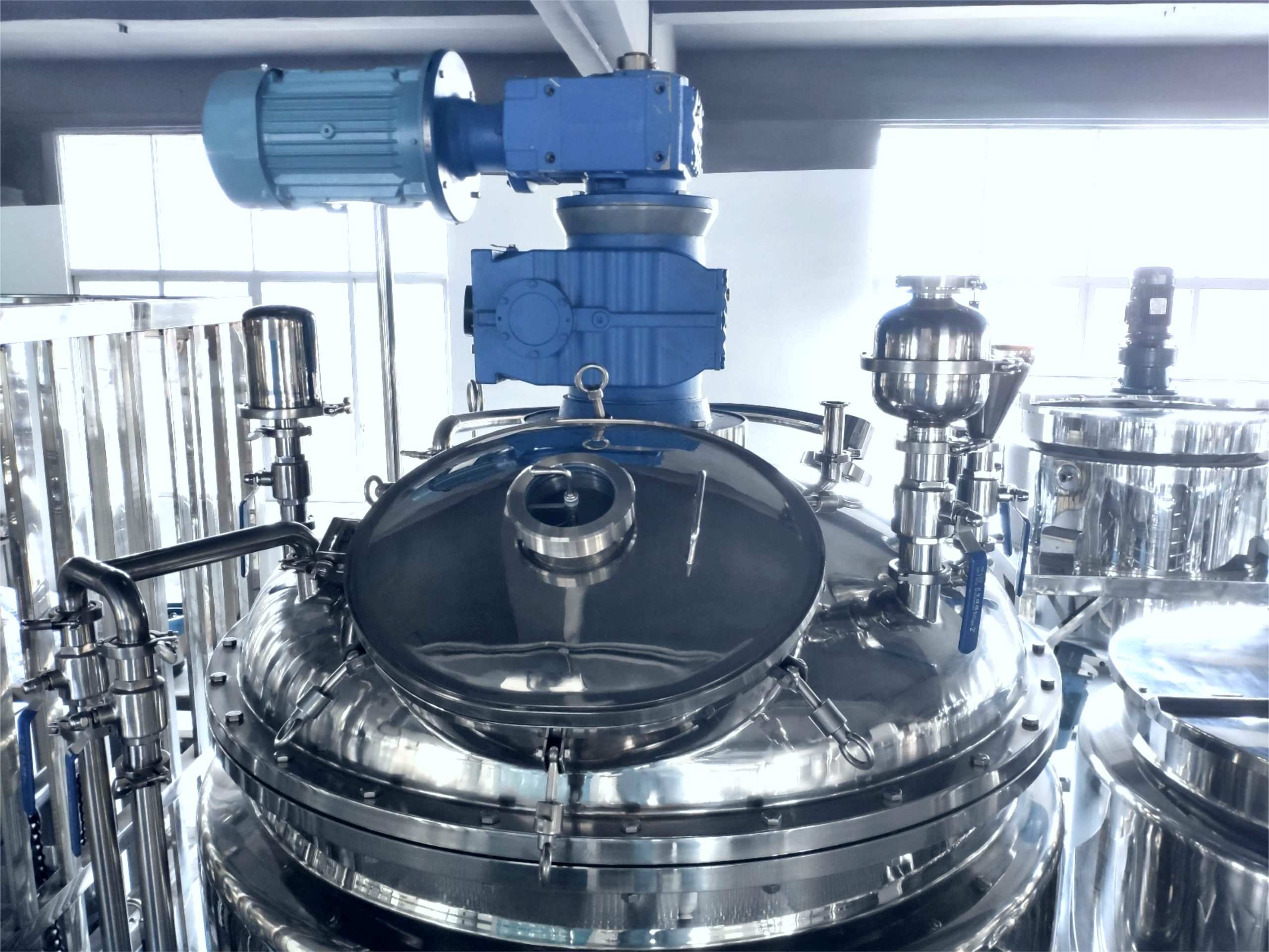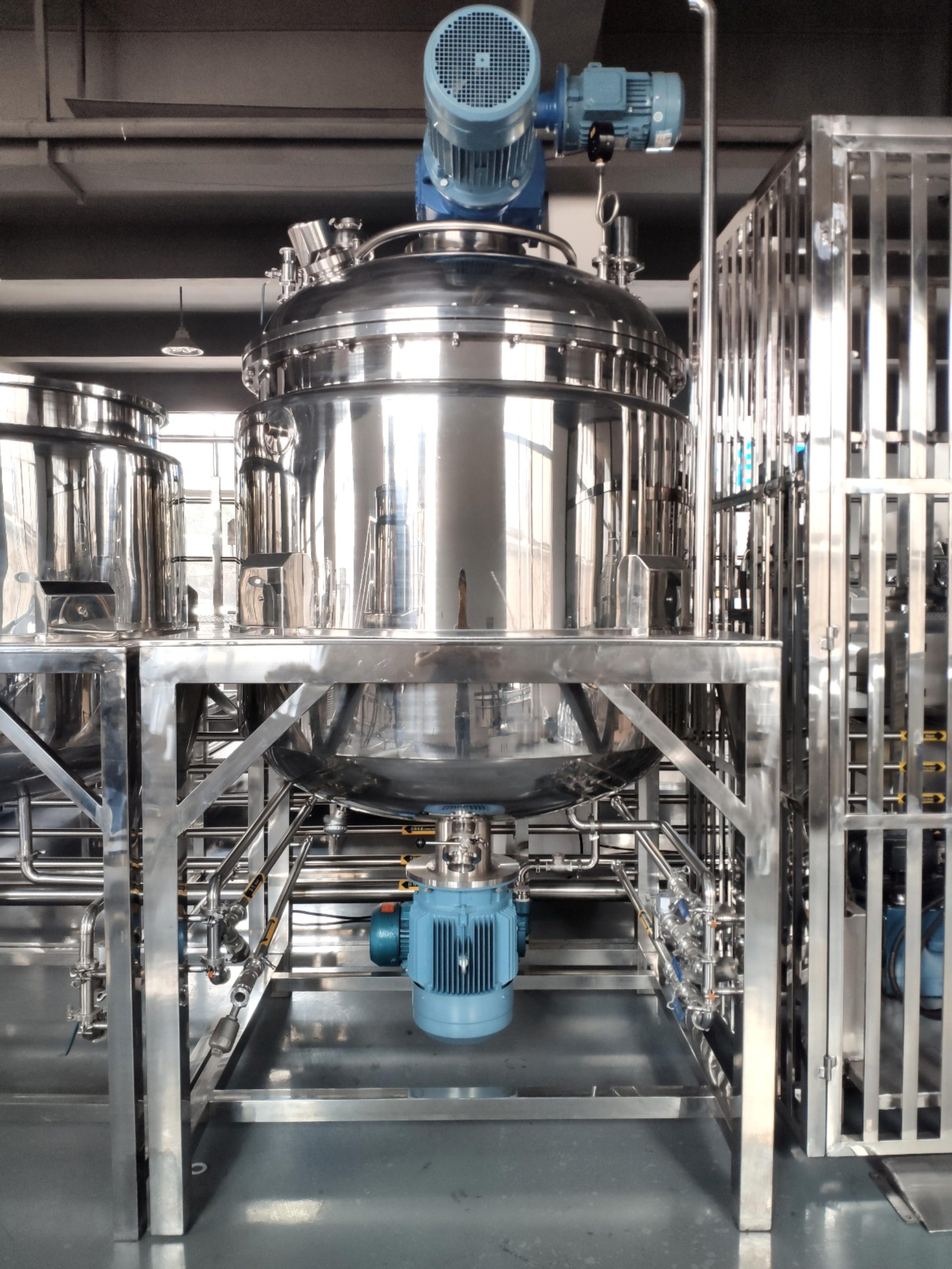 該設(shè)備由乳化攪拌罐、水相罐、油相罐、液壓升降系統(tǒng)、控制系統(tǒng)、均質(zhì)器、攪拌系統(tǒng)及真空系統(tǒng)構(gòu)成。在真空環(huán)境下,通過高剪切乳化機(jī)實現(xiàn)多相物料的高速均勻分散。物料在轉(zhuǎn)子與定子構(gòu)成的狹小空間內(nèi),借助設(shè)備產(chǎn)生的強(qiáng)大動能,經(jīng)受液壓剪切、離心擠壓、沖擊破碎及湍流等多重作用,實現(xiàn)瞬時均勻分散乳化。經(jīng)高頻往復(fù)循環(huán)處理后,最終獲得穩(wěn)定性優(yōu)異且無氣泡的高品質(zhì)成品。