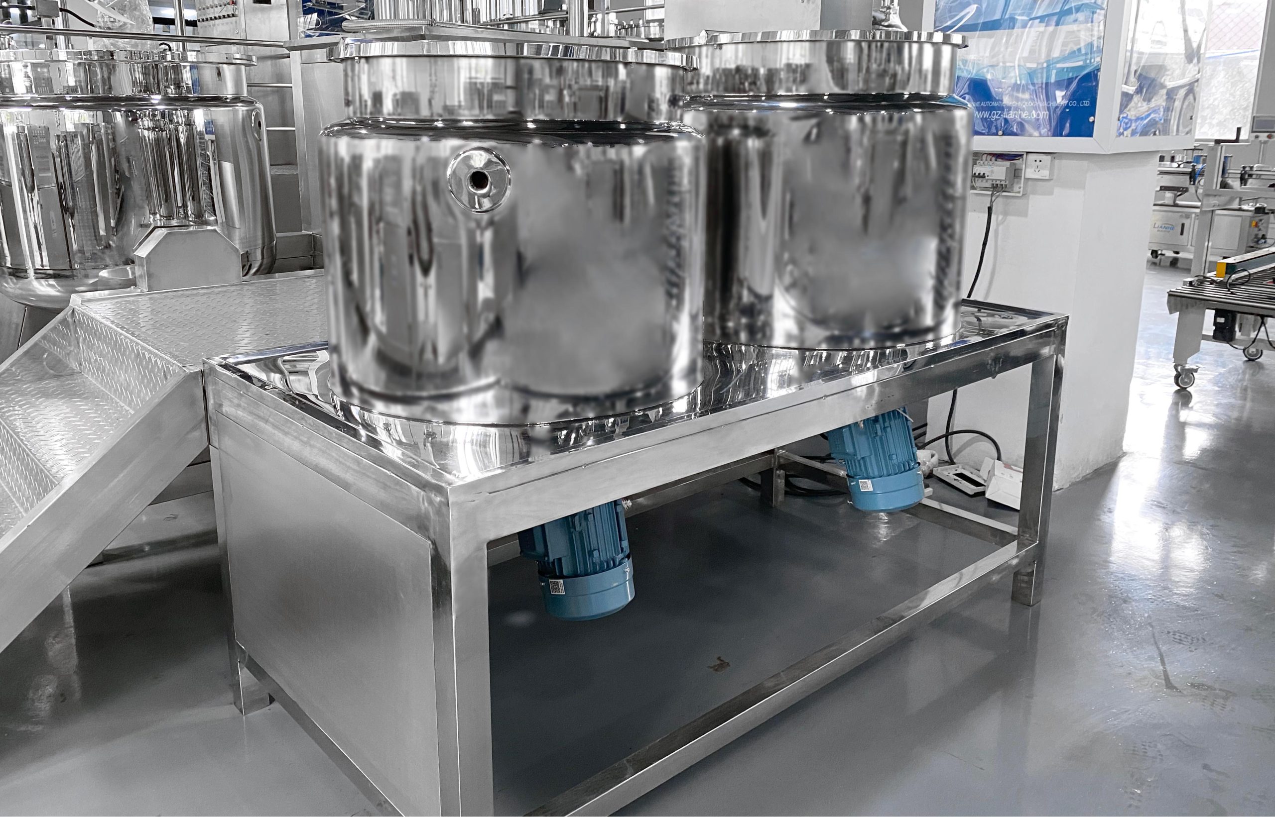 該設(shè)備由乳化攪拌罐、水相罐、油相罐、液壓升降系統(tǒng)、控制系統(tǒng)、均質(zhì)器、攪拌系統(tǒng)及真空系統(tǒng)構(gòu)成。在真空環(huán)境下,通過高剪切乳化機實現(xiàn)多相物料的高速均勻分散。物料在轉(zhuǎn)子與定子構(gòu)成的狹小空間內(nèi),借助設(shè)備產(chǎn)生的強大動能,經(jīng)受液壓剪切、離心擠壓、沖擊破碎及湍流等多重作用,實現(xiàn)瞬時均勻分散乳化。經(jīng)高頻往復(fù)循環(huán)處理后,最終獲得穩(wěn)定性優(yōu)異且無氣泡的高品質(zhì)成品。